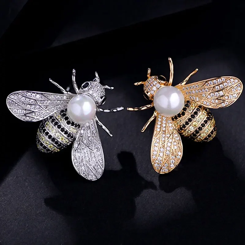 A delicate bee brooch crafted from zinc alloy with simulated pearl accents and crystal rhinestones. This classic design offers a charming fashion touch for women.