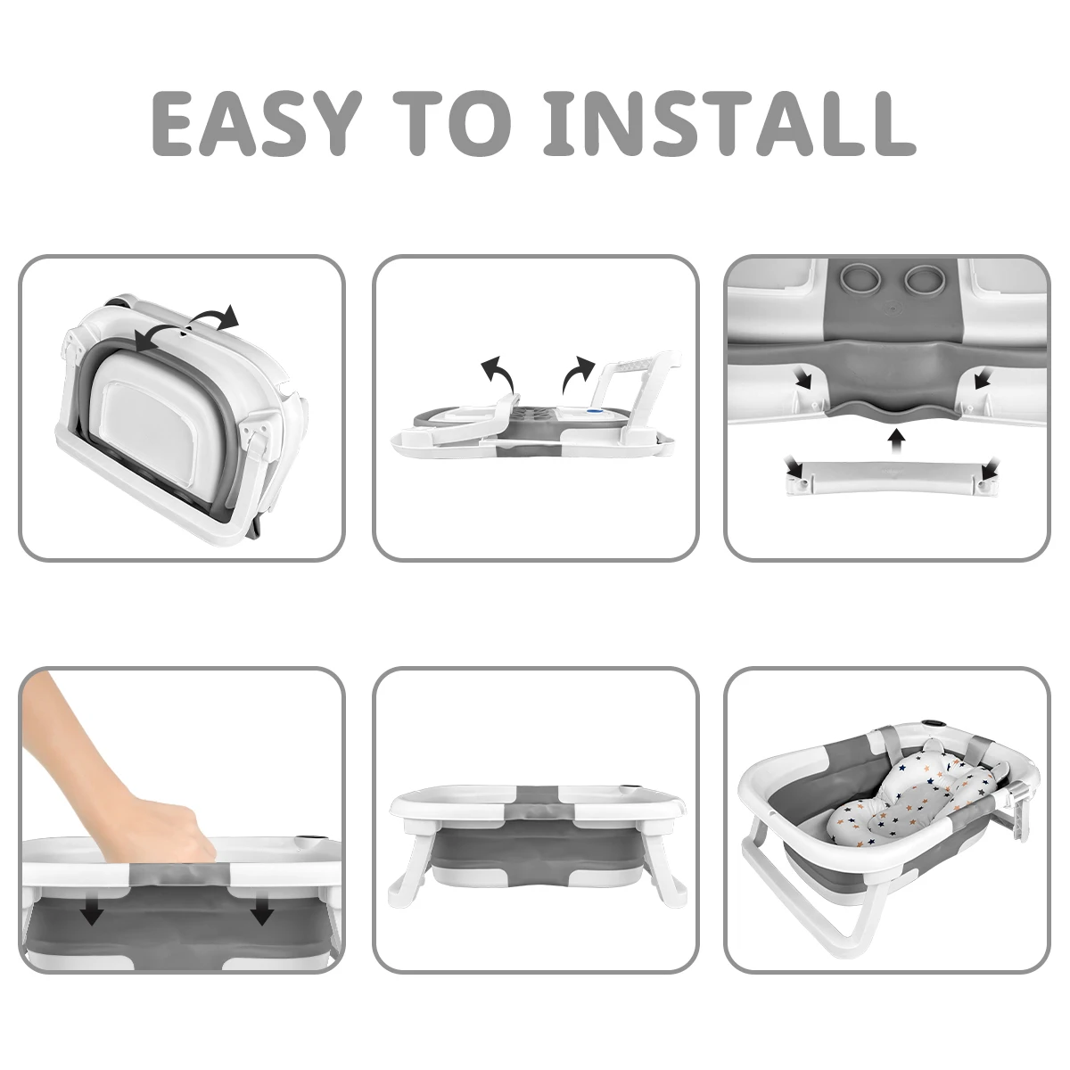 A foldable baby bathtub designed with a soft cushion and a built in thermometer. Its portable structure makes it suitable for travel and everyday use.