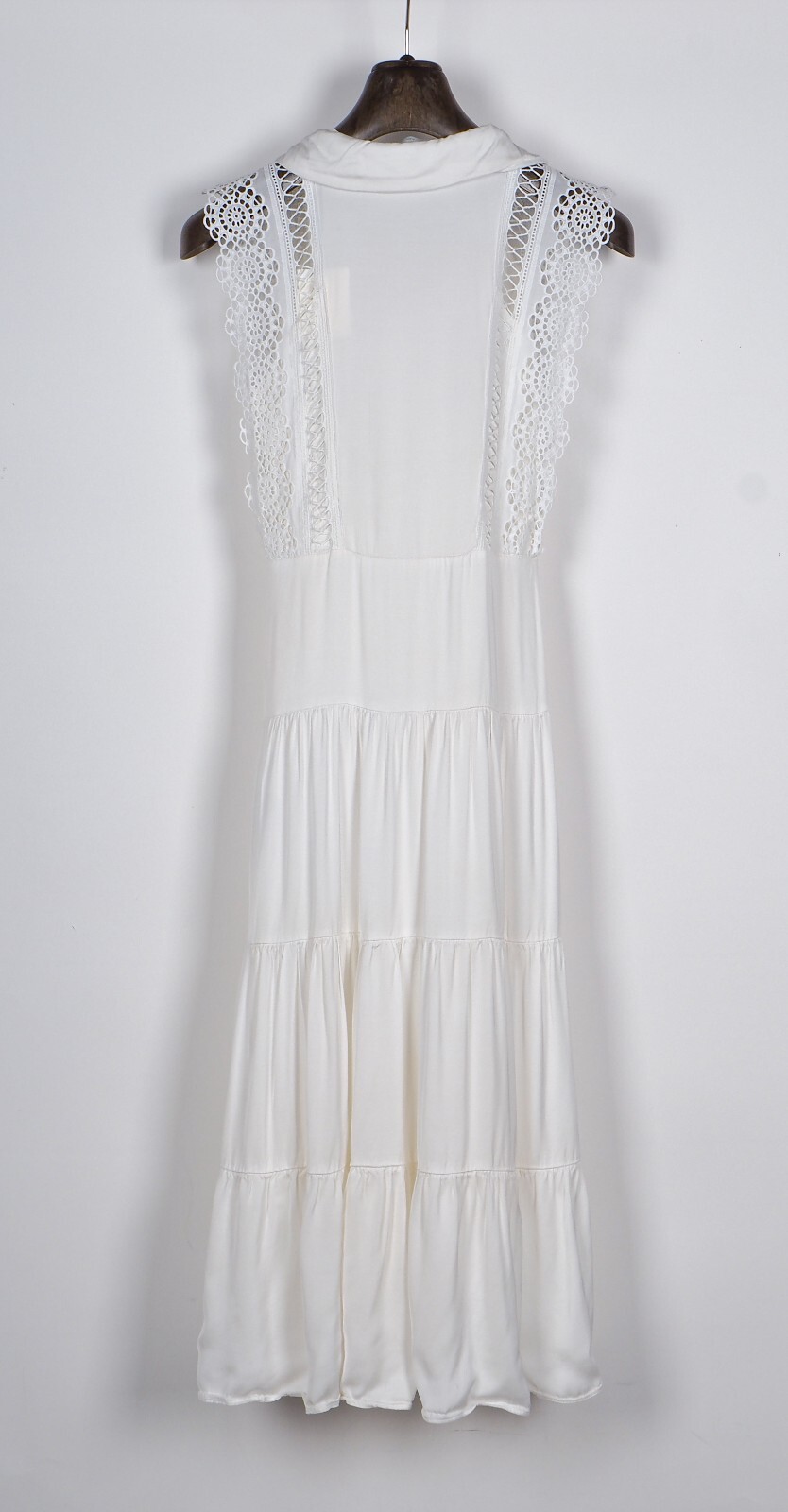 This Sandro Paris white midi dress features a sleeveless design with a tiered A line silhouette that creates a clean, structured shape. The collared neckline adds a tailored detail, while the zip closure keeps the overall look refined and minimal.