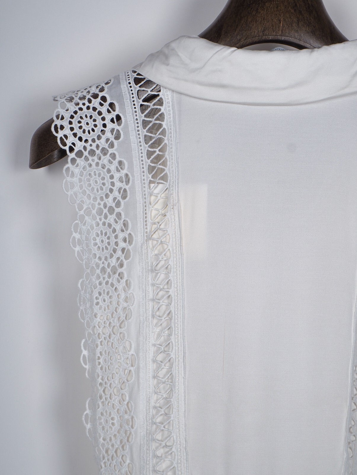 A white Sandro Paris midi dress in size S, designed with a sleeveless A line silhouette, collared neckline, zip closure, and embroidered accents.